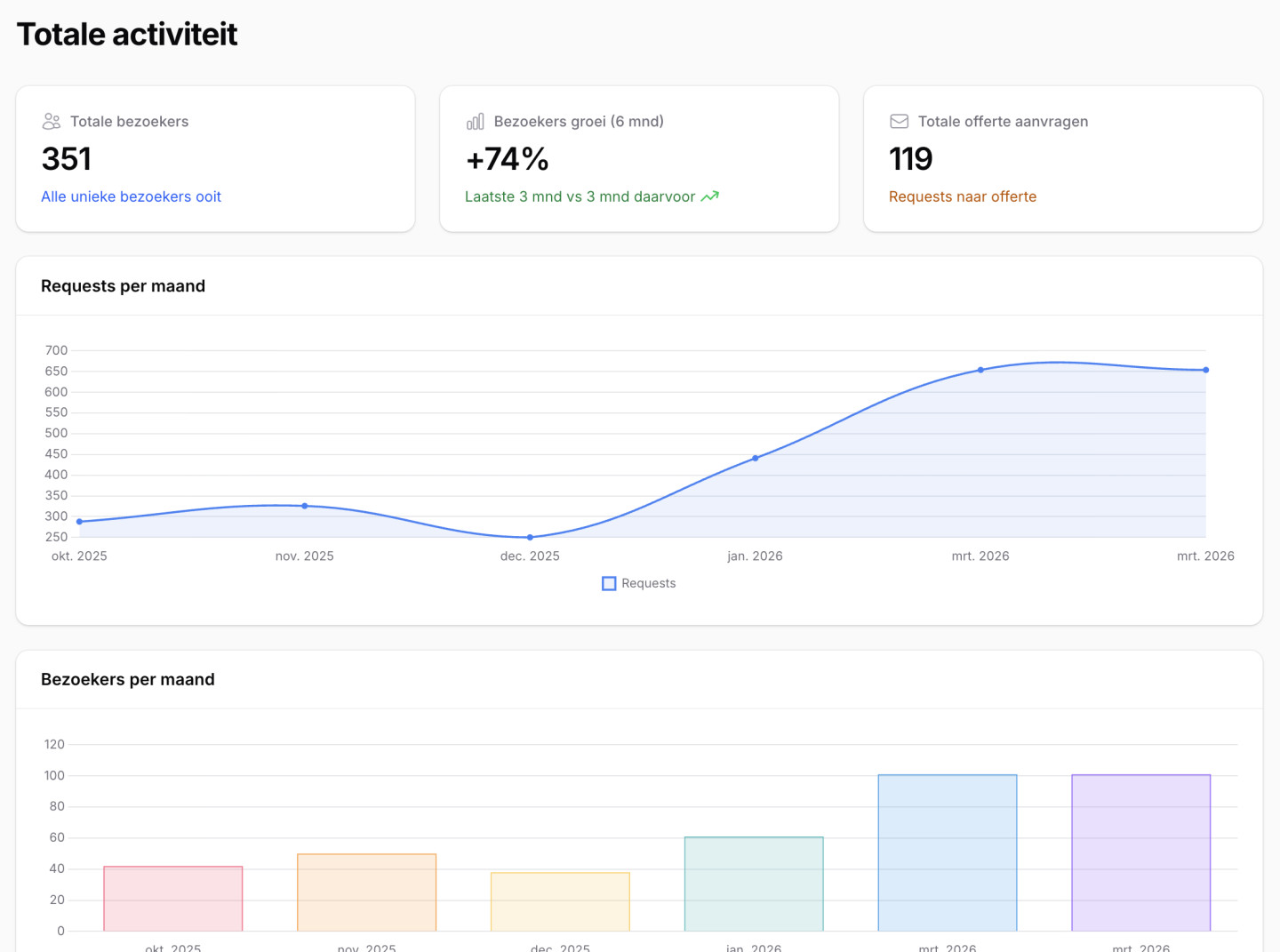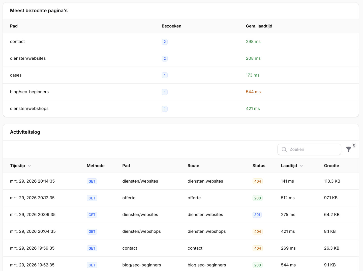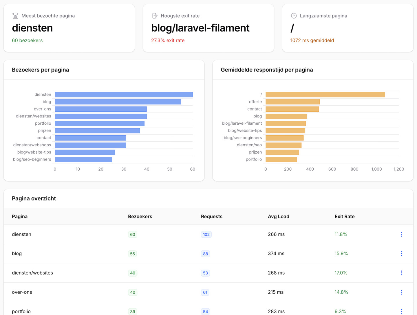Via een overzichtelijk dashboard zie je in één oogopslag hoeveel mensen jouw website bezoeken, welke pagina's populair zijn en hoe snel alles laadt. Zo weet je altijd wat er speelt zonder technische kennis nodig.